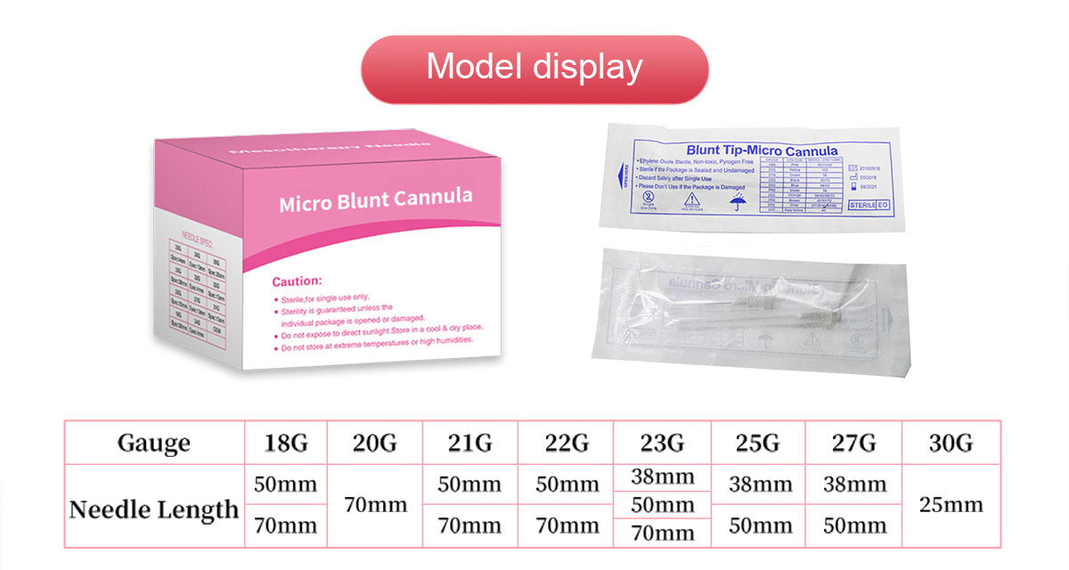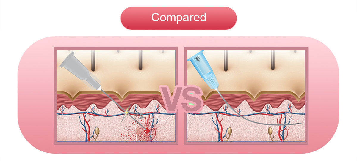 Uma cânula romba permite que os vasos sanguíneos sejam "afastados" à medida que a microcânula se move ao redor do tecido sob a pele, em vez de perfurar os vasos sanguíneos como nas agulhas tradicionais. Segurança de ferir os nervos.
